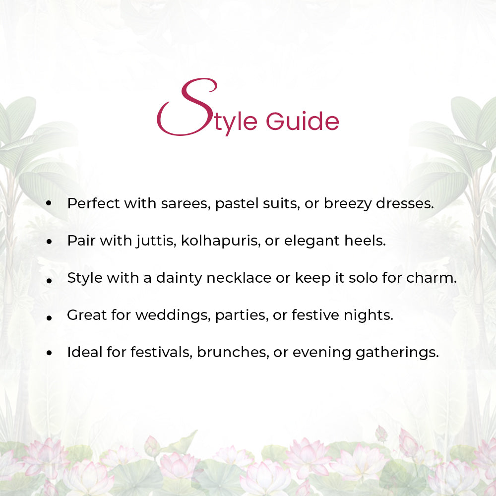 It's beautiful and very elegant earrings. Goes well with sarees and suit sets. It's light weight and extremely gorgeous. Beautiful finishing.