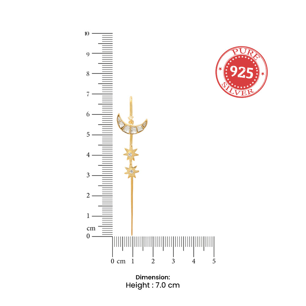 One of our favourite needle earcuffs. The moon motif has sparkling kundan stones and gently moves as you move . Below it, are star motifs with white zircons in the centre. Handcrafted in pure 92.5 silver and available in both natural silver and gold plated.