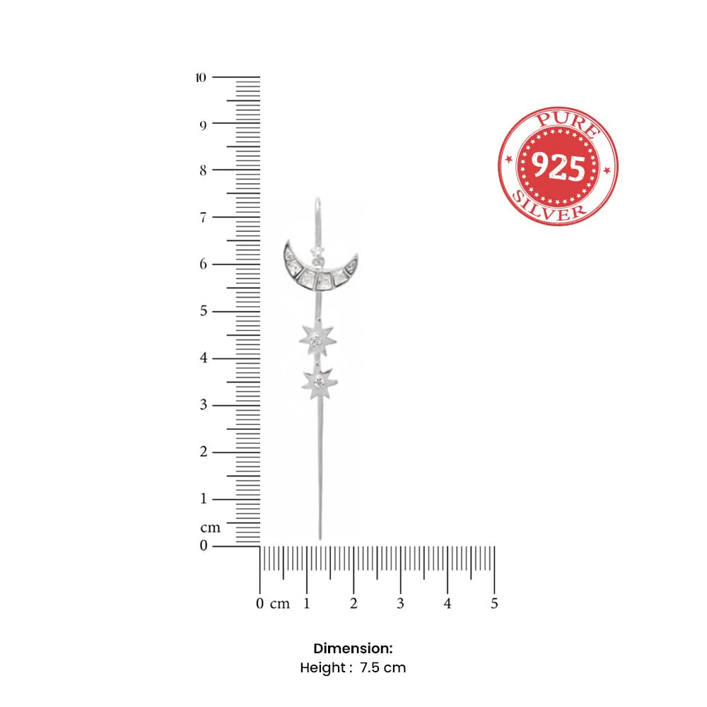 One of our favourite needle earcuffs. The moon motif has sparkling kundan stones and gently moves as you move . Below it, are star motifs with white zircons in the centre. Handcrafted in pure 92.5 silver and available in both natural silver and gold plated.