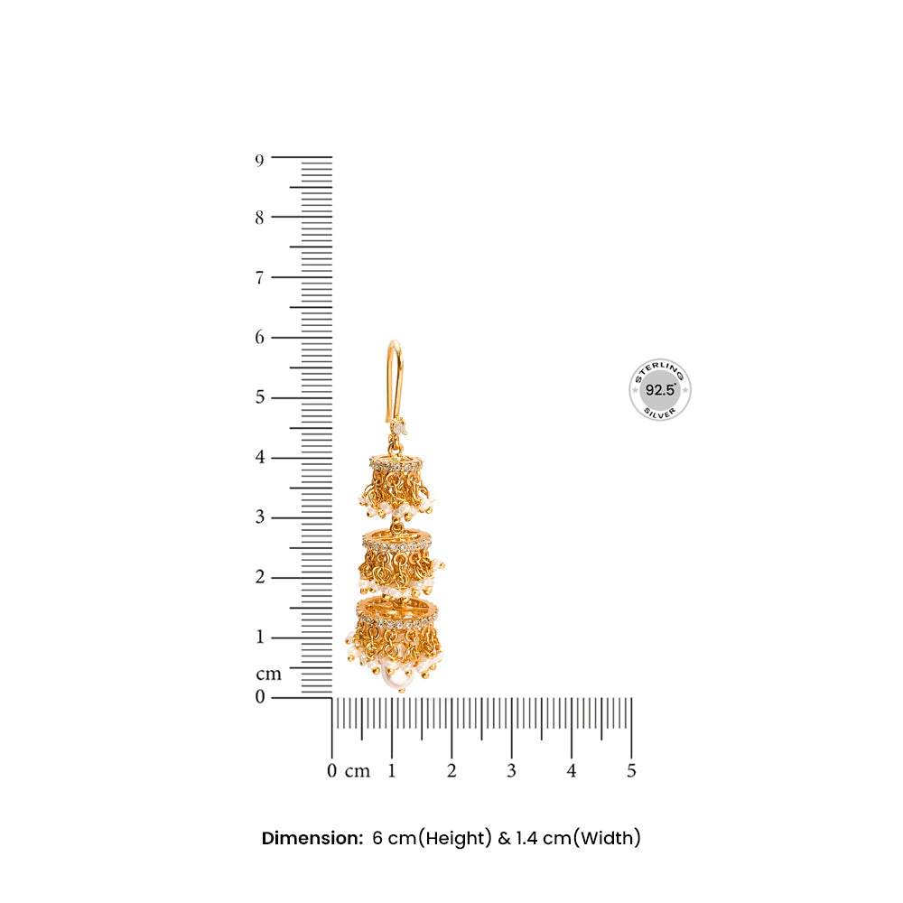 A symphony of tradition and craftsmanship, these chandelier earrings are handcrafted in pure silver and finished with 24K gold plating. Inspired by temple bells and royal tiers, each layer is delicately embellished with green zircon beads and tiny pearls that add rhythm and movement to every turn. The cascading design captures festive opulence while remaining effortlessly wearable.