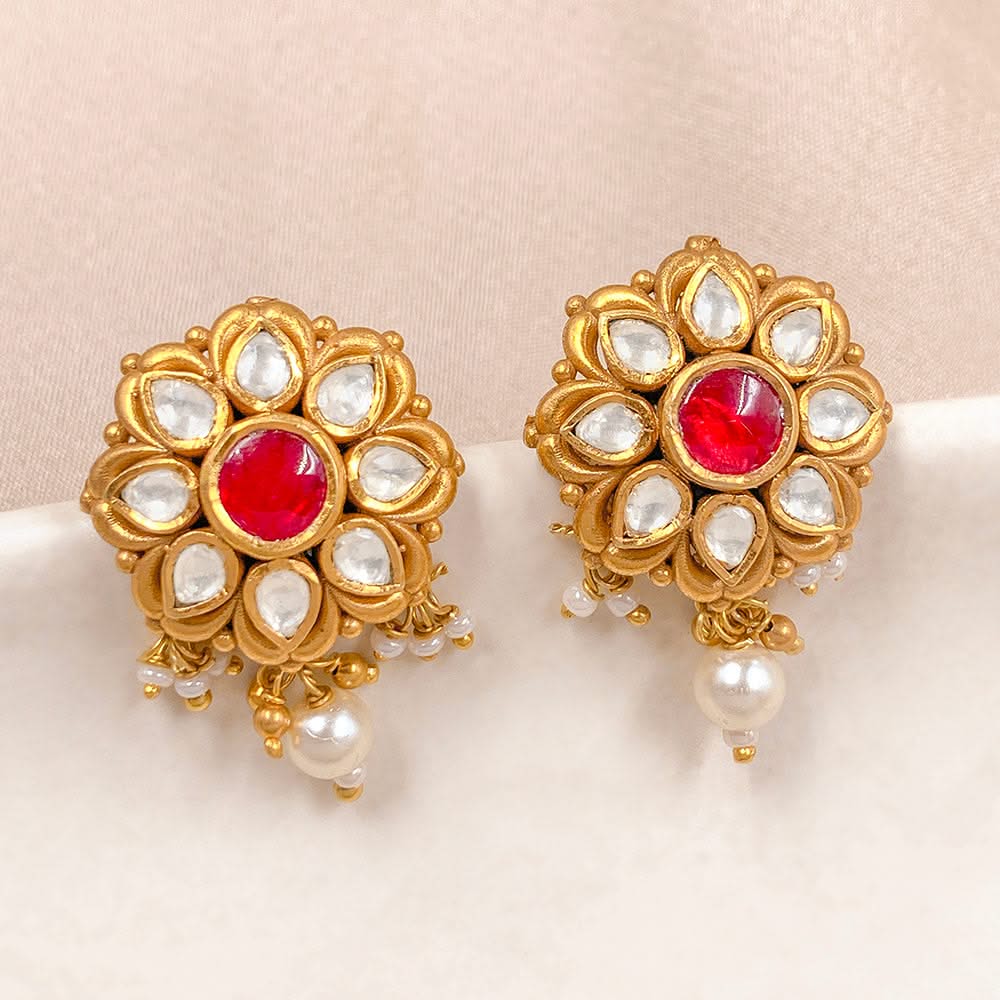 Handcrafted in pure 92.5 sterling silver with a rich 24K gold plating, the Padma Studs are designed like a blooming lotus. A bold ruby-red stone forms the heart of the design, surrounded by sparkling kundan-style white stones that radiate outwards in petal-like patterns. A single pearl drop adds a soft and graceful finish, making this piece perfect for both bridal and festive wear.