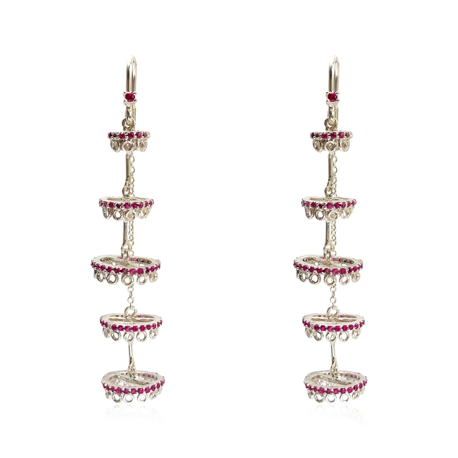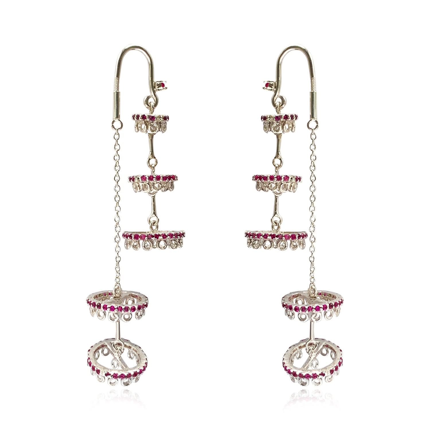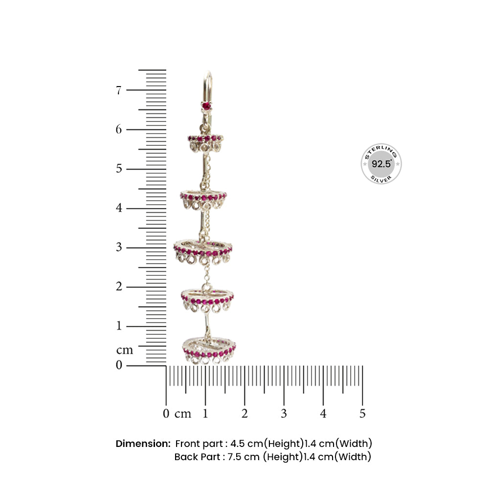 Make a statement with these exquisite Raeesilver chandelier earrings, handcrafted in 92.5 sterling silver. Featuring cascading tiers adorned with brilliant red zircons, each layer moves with fluid grace, reflecting light and elegance in every step. The intricate detailing and rhythmic symmetry evoke timeless grandeur, Perfect for festive occasions, weddings, or evening soirées.