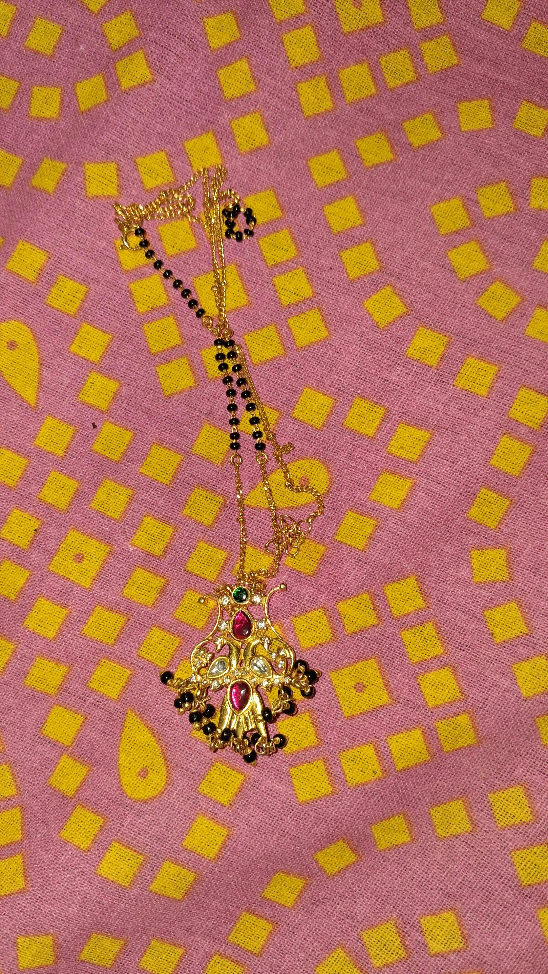 Beautiful handcrafted pendant with modern mangalsutra chains. The pendant is finished with cute black bead hangings. Perfect addition to your collection.