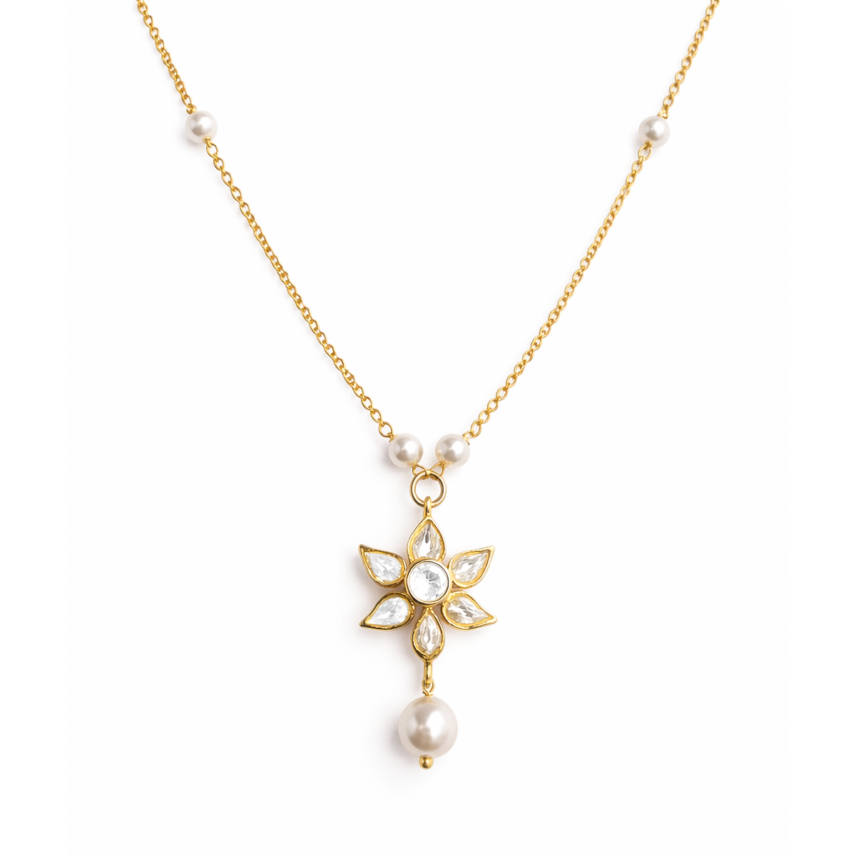 A Kundan floral pendant in 92.5 pure silver with 24kt gold plating — five Kundan-set white stones, a pearl drop finish and a pearl-studded chain. Rich, regal and made for every occasion that deserves a little extra.