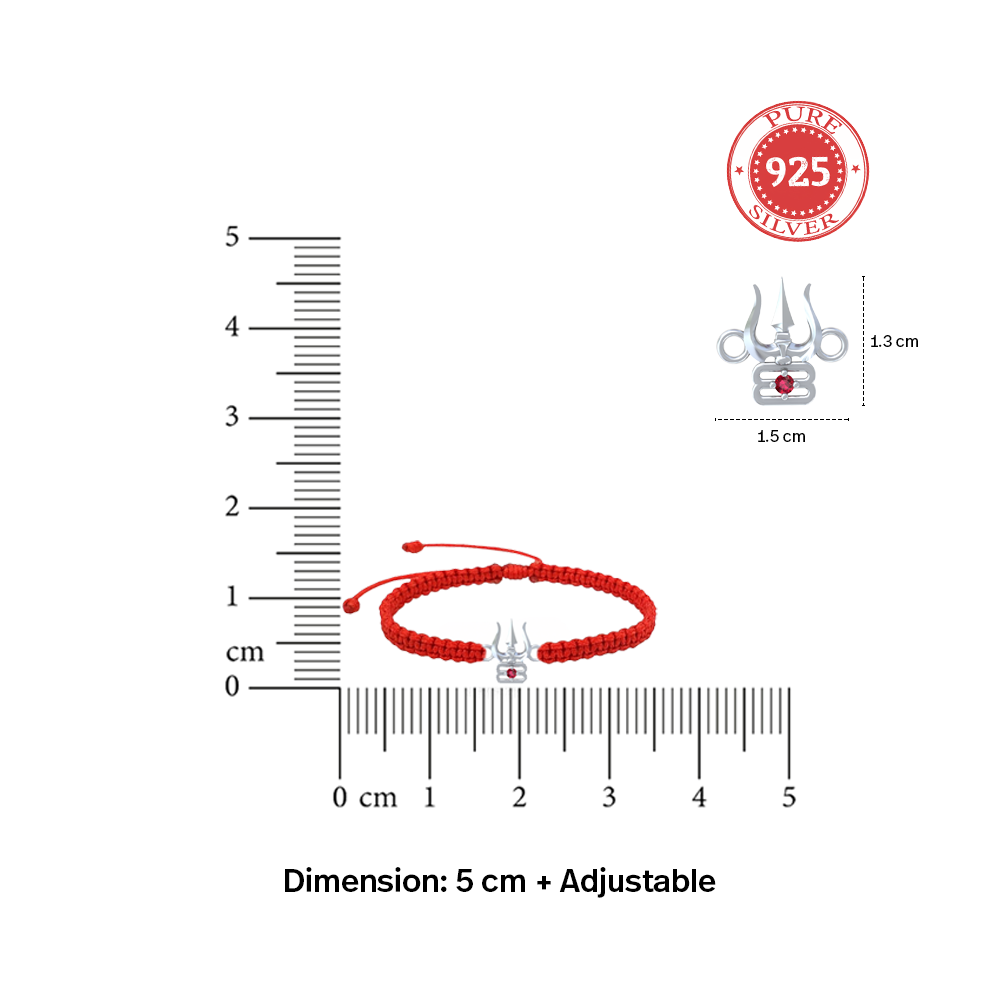 Inspired by the divine symbols of Lord Shiva, this 92.5 Silver Trishul with Chand and Tripundra Bracelet is a powerful emblem of protection and faith. Meticulously crafted in 92.5 sterling silver, the central charm features the sacred Trishul (Trident) resting atop a Tripundra (tilak) base with a vibrant red zircon at its heart. Woven into a durable, adjustable red thread, this bracelet blends spiritual significance with a rugged, modern aesthetic.