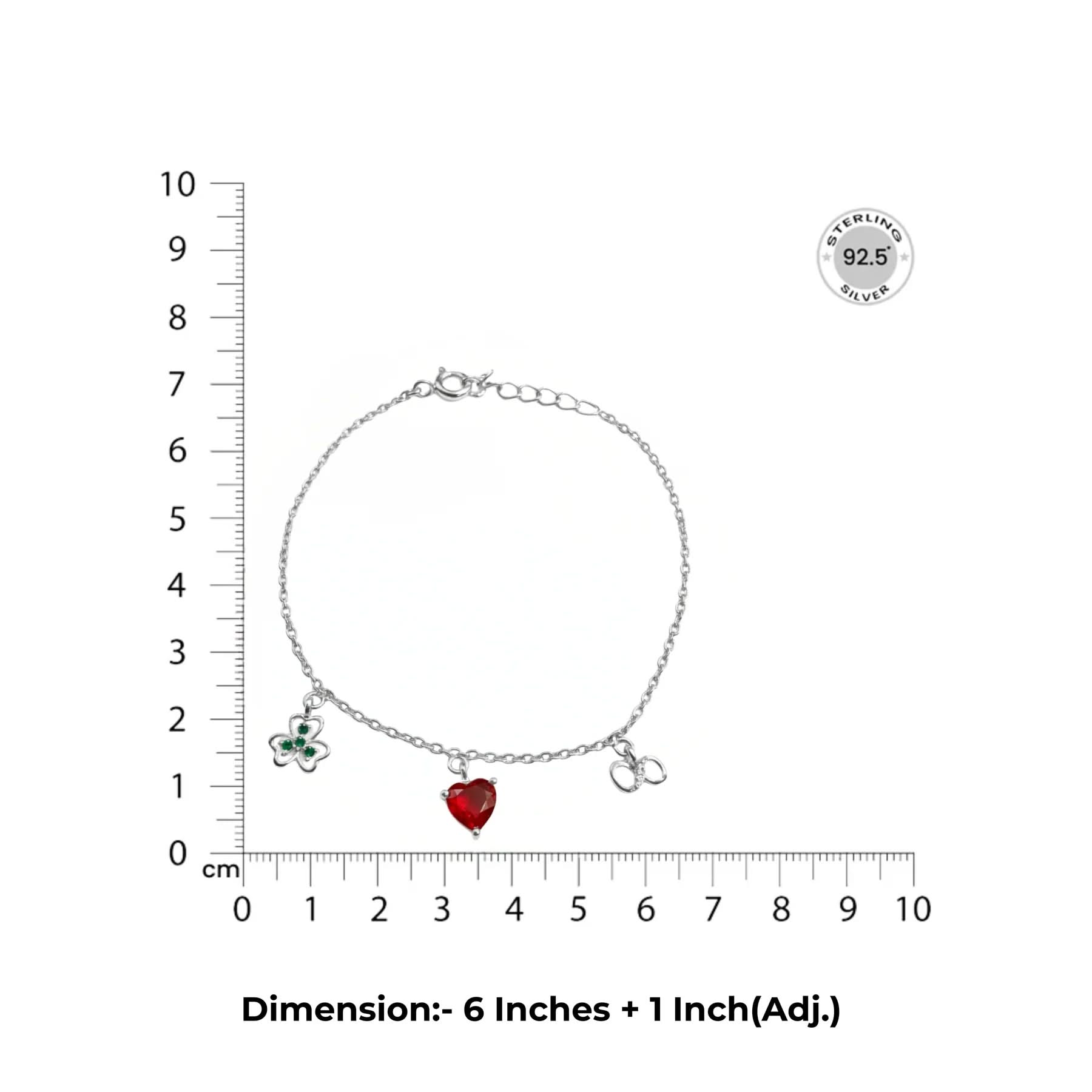 Delicate, colourful, and full of charm this Heart & Clover Charm Bracelet is crafted in 925 sterling silver and finished with a luxurious gold polish. The design features three dainty motifs: a sparkling emerald-green clover, a vibrant ruby-red heart, and a minimal   beautifully spaced along a fine chain.