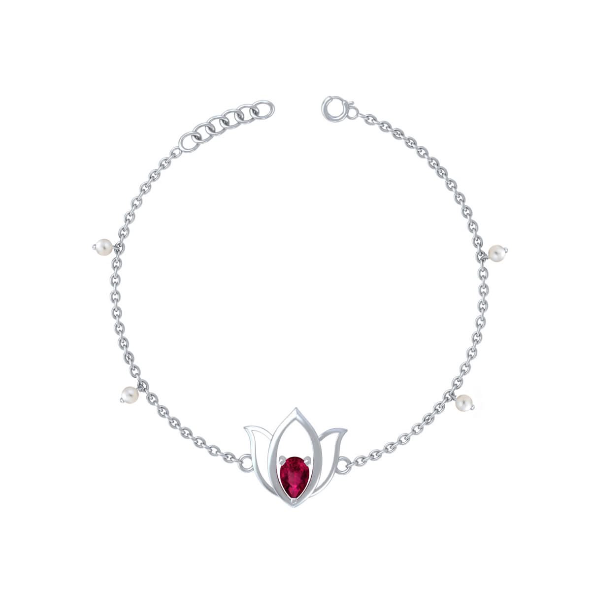 Unniyarcha 925 Pure Silver Lotus Bracelet with Ruby Red Stone & Pearl — Adjustable