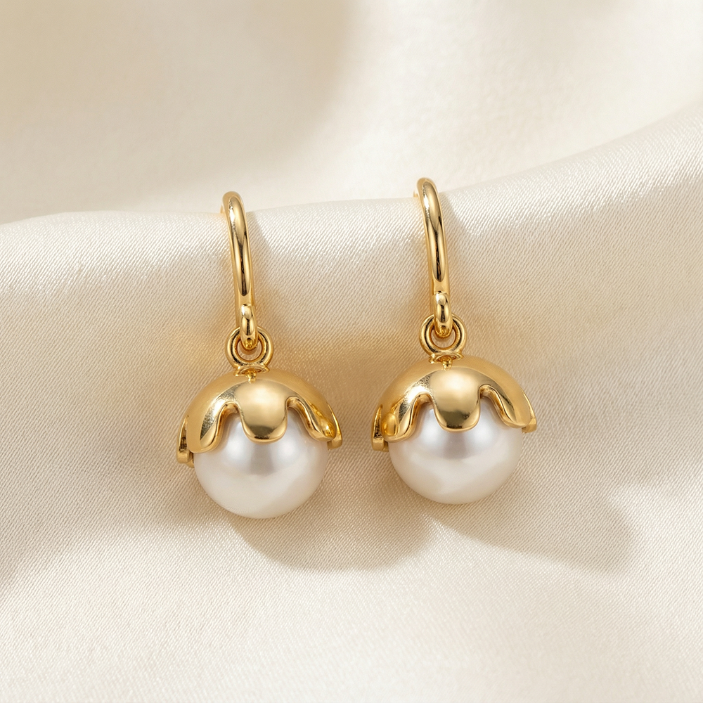 Elegant gold drop earrings featuring luminous pearl accents, crowned with a soft, petal-like gold setting. Timeless and refined, they add a subtle touch of luxury to both everyday looks and special occasions.