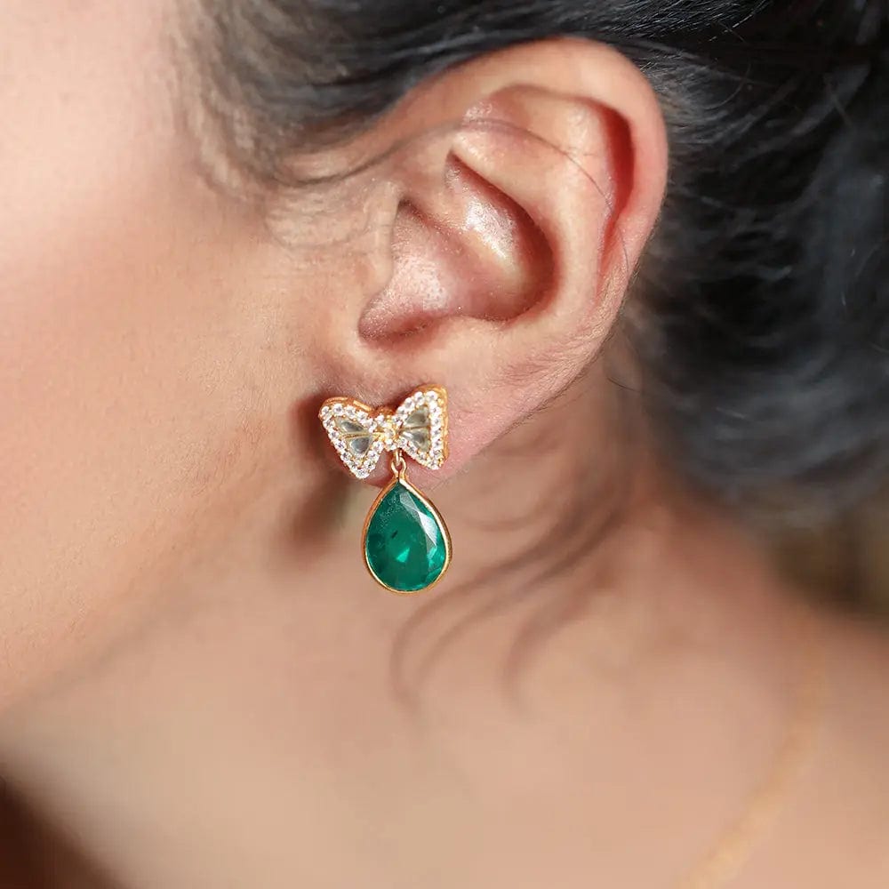 - This earring is stylish and perfect for those work meetings, coffee date or just a quick trip to the grocery store. The bright green stone is the perfect " pick me up " the outfit needs and make a beautiful contrast with the semiprecious polki stones.