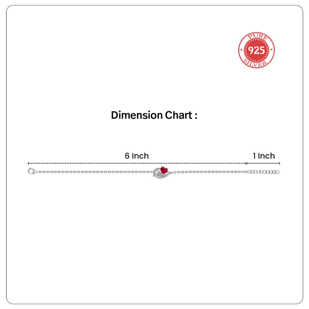 This elegant bracelet features a delicate lovebird inspired motif in polished 92.5 silver, cradling a deep red heart-shaped stone symbolizing affection and enduring bonds. The sleek silhouette and subtle detailing give it a refined, poetic charm, making it a graceful expression of love and companionship.