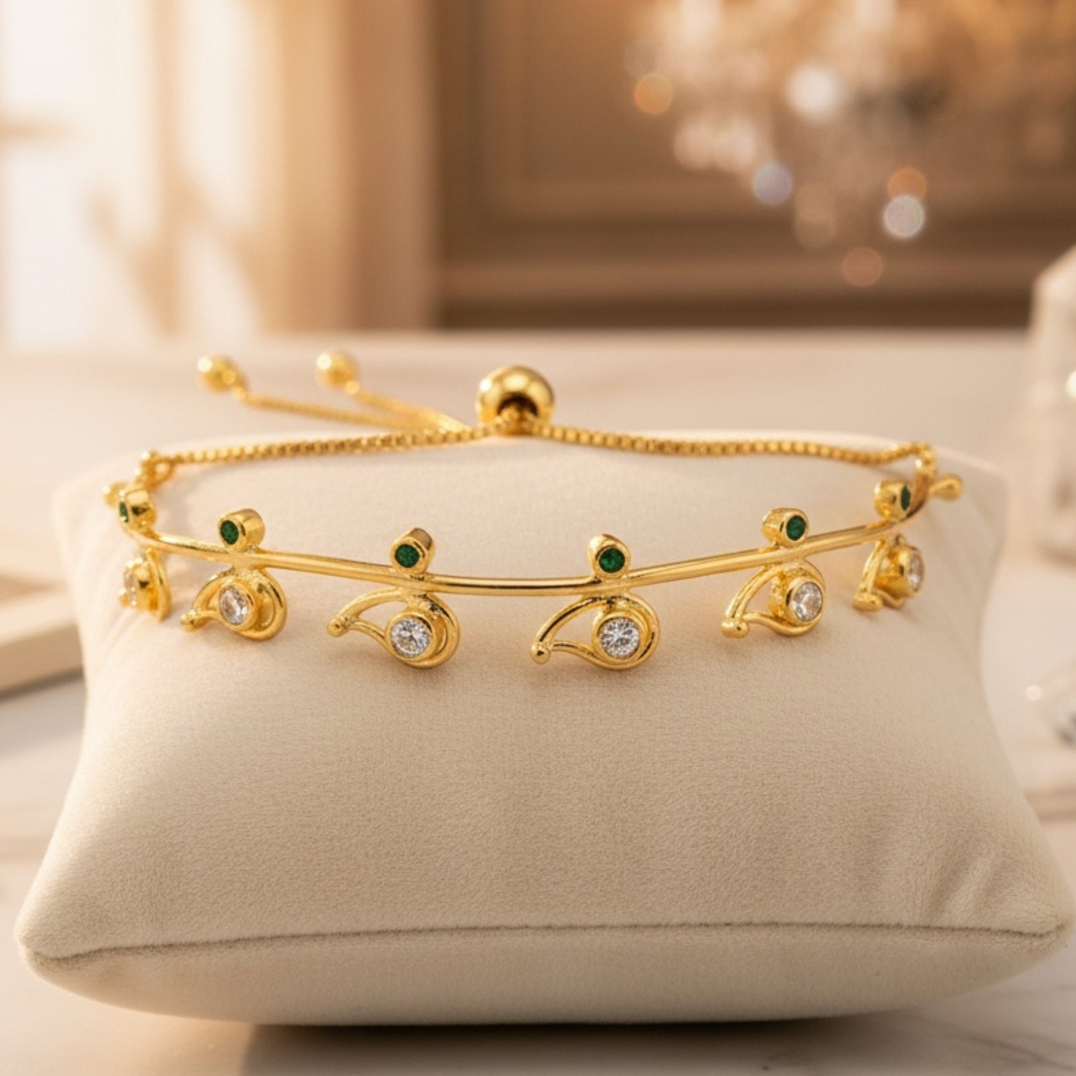 This beautiful and elegant cuff is handcrafted in pure 92.5 silver. It has bright green zircons on one side and a beautiful motif with sparkling white zircons on the other side.