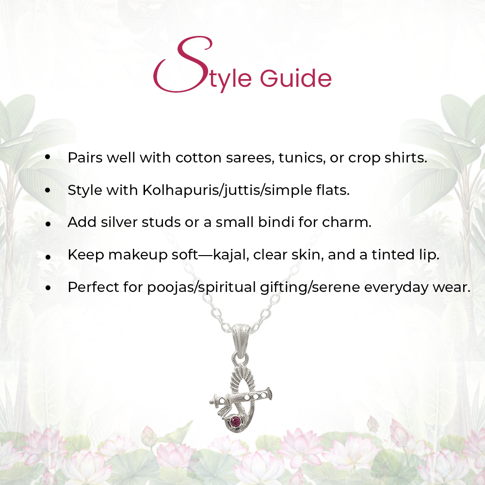 Embrace divinity and grace with the Krishna Melody Pendant, meticulously crafted in 925 Sterling Silver. Inspired by Lord Krishna’s enchanting flute, this pendant captures the essence of spiritual charm and musical harmony. Adorned with a touch of pink gemstone detailing, the design brings a subtle pop of color while preserving a classic elegance