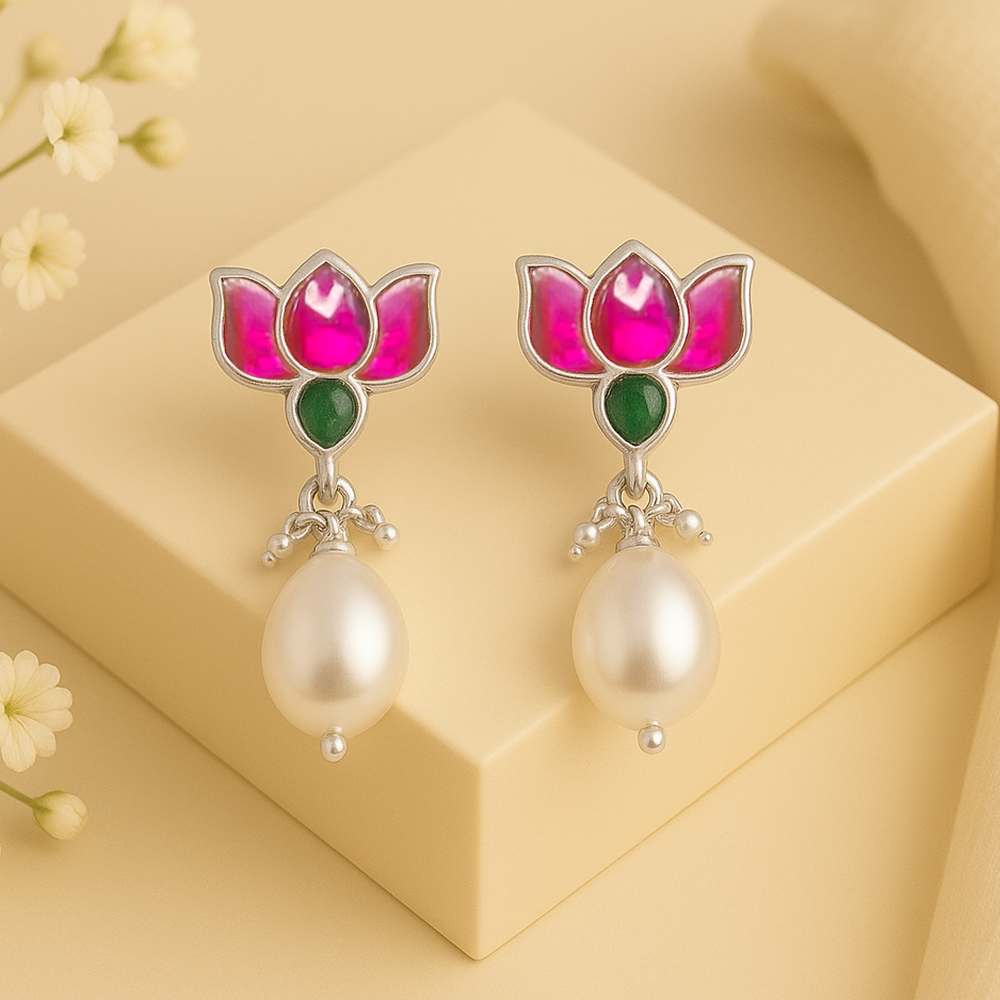 Silver Sui Dhaga earrings with lotus motif, handcrafted in 92.5 sterling silver