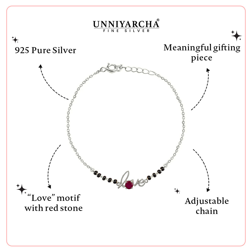 Delicately handcrafted in 925 sterling silver, this elegant bracelet features classic black beads paired with a graceful silver love motif and a striking ruby-red stone at the centre. The fluid silver detailing adds a modern touch, while the black beads bring timeless charm and everyday versatility.
