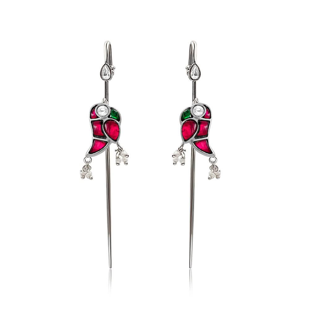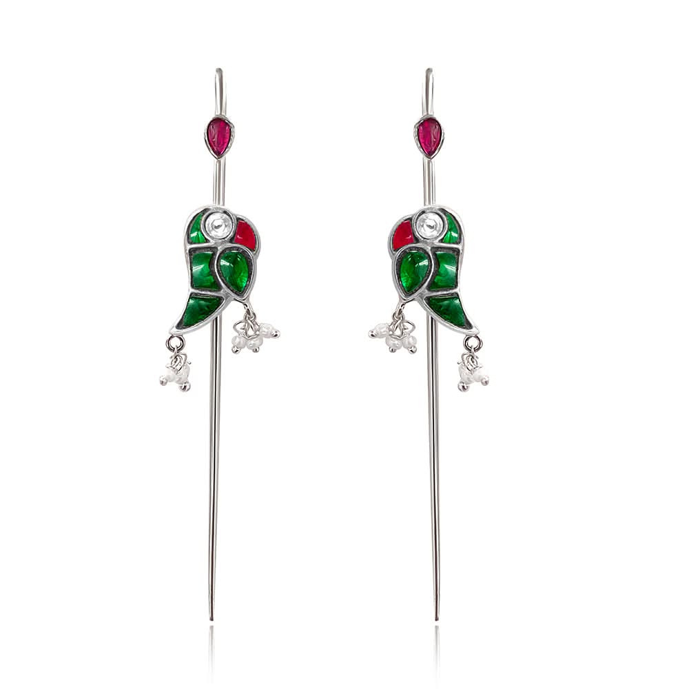 Bold yet graceful, these Parrot Needle Ear Cuffs are a contemporary take on traditional motifs. Handcrafted in pure 92.5 silver, each piece showcases a vibrant red-and-green parrot motif embellished with kundan detailing. The sleek needle drop design adds an edgy silhouette, making them the perfect balance of tradition and modernity.