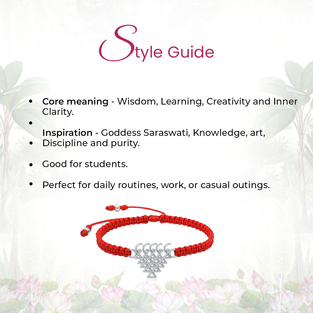 Hand-braided in a vibrant red sacred thread, this bracelet blends spiritual significance with everyday elegance. Adjustable for a comfortable fit, it is ideal for students, artists, professionals, and anyone seeking balance between intellect and intuition.