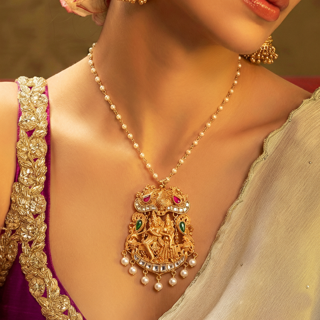 A divine expression of eternal love and devotion, this exquisitely crafted Radha–Krishna temple pendant is inspired by traditional South Indian temple jewellery. The central motif beautifully depicts Lord Krishna with Radha by his side, symbolising divine union, harmony, and unconditional love.