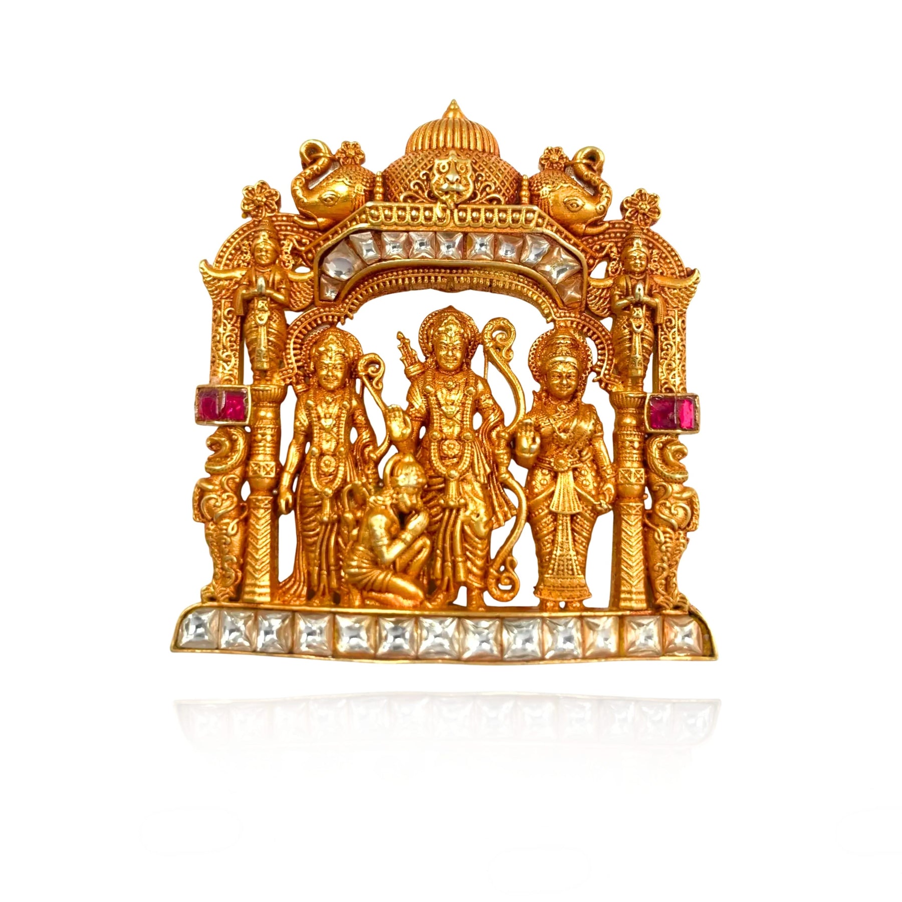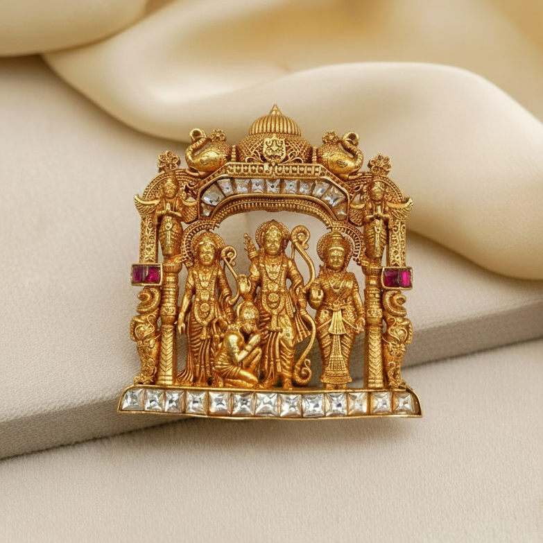 A timeless symbol of devotion and dharma, this Ram Darbar pendant beautifully depicts Lord Ram, Goddess Sita, Lord Lakshman, and Lord Hanuman in an intricately crafted temple-style frame. Designed to reflect traditional South Indian temple artistry, every detail from the ornate arch to the finely sculpted expressions celebrates heritage, faith, and craftsmanship.