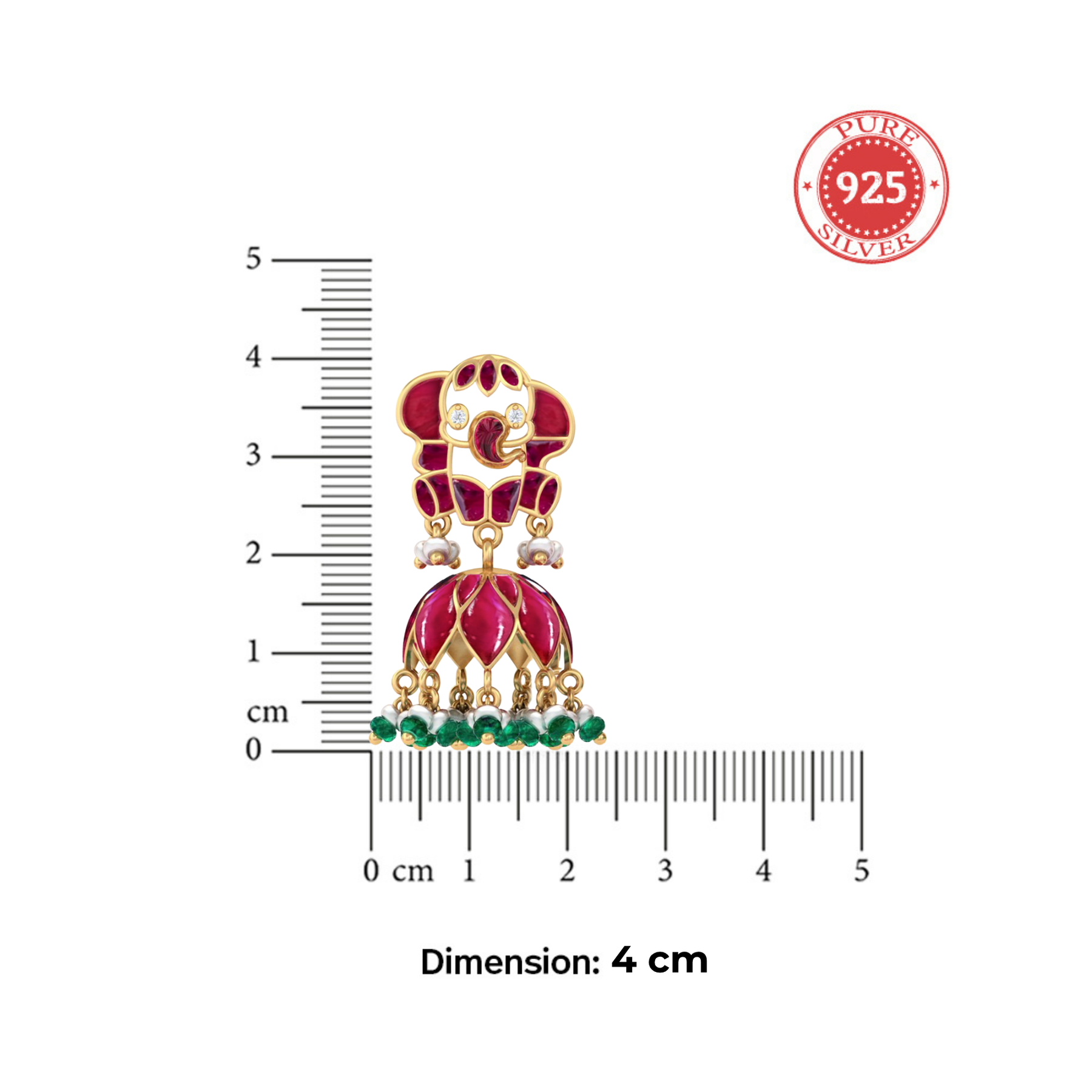 A graceful pair of Jhumka earrings featuring a charming baby elephant motif at the stud, beautifully inlaid with vibrant ruby-red stones. The design flows into a traditional bell-shaped drop adorned with matching stones and finished with delicate green and white beads. These earrings add depth and elegance while keeping a playful charm, making them perfect for festive wear without being heavy.