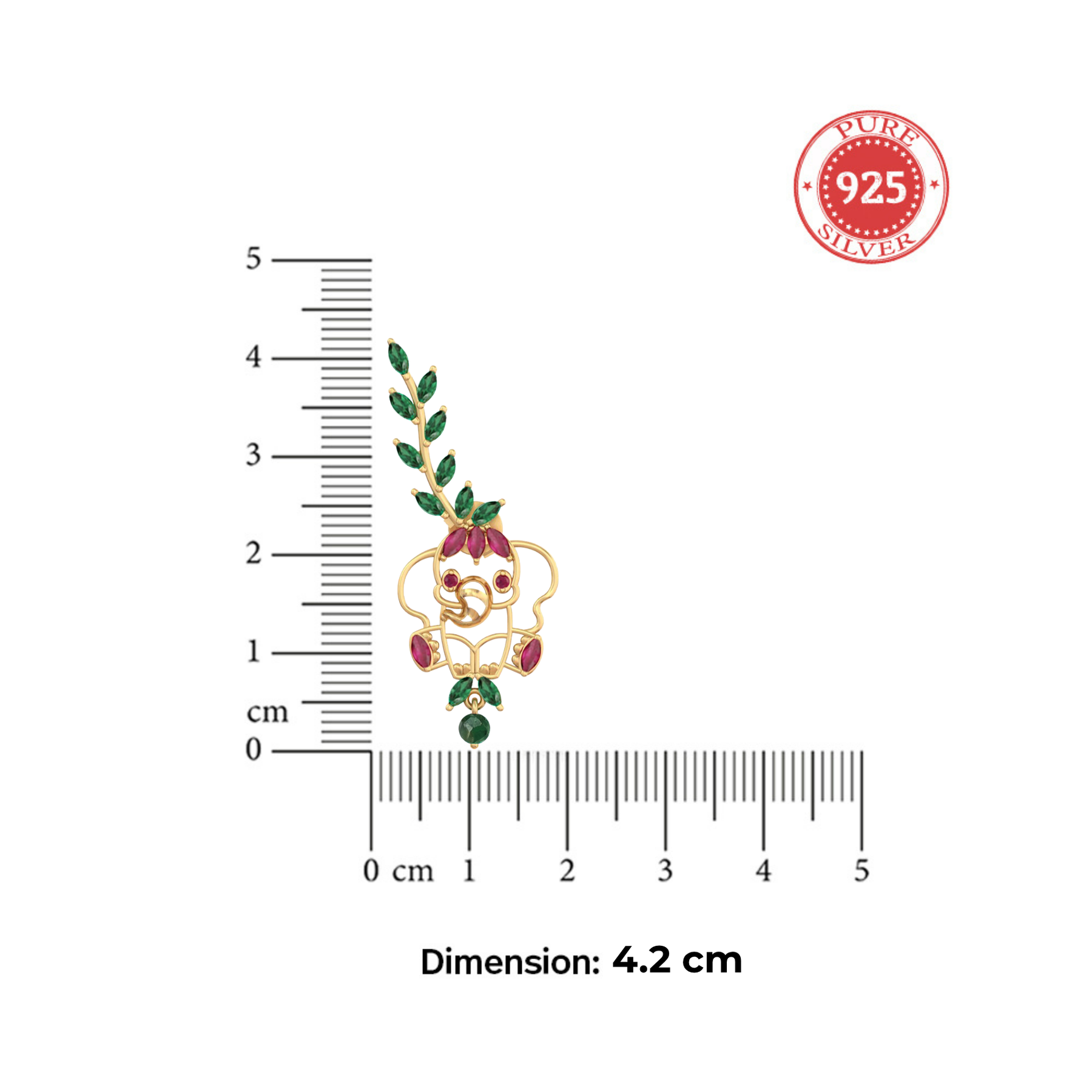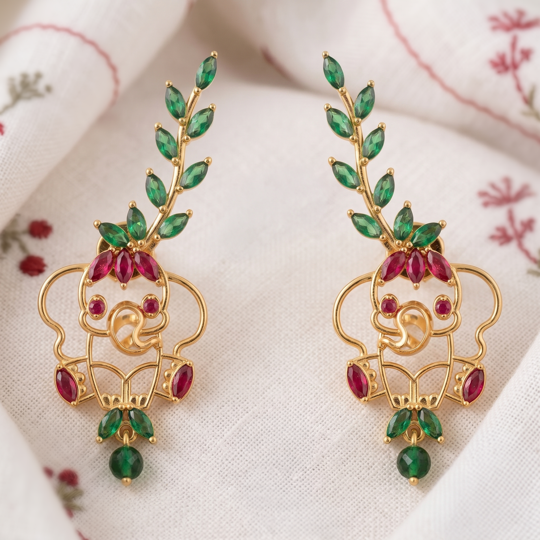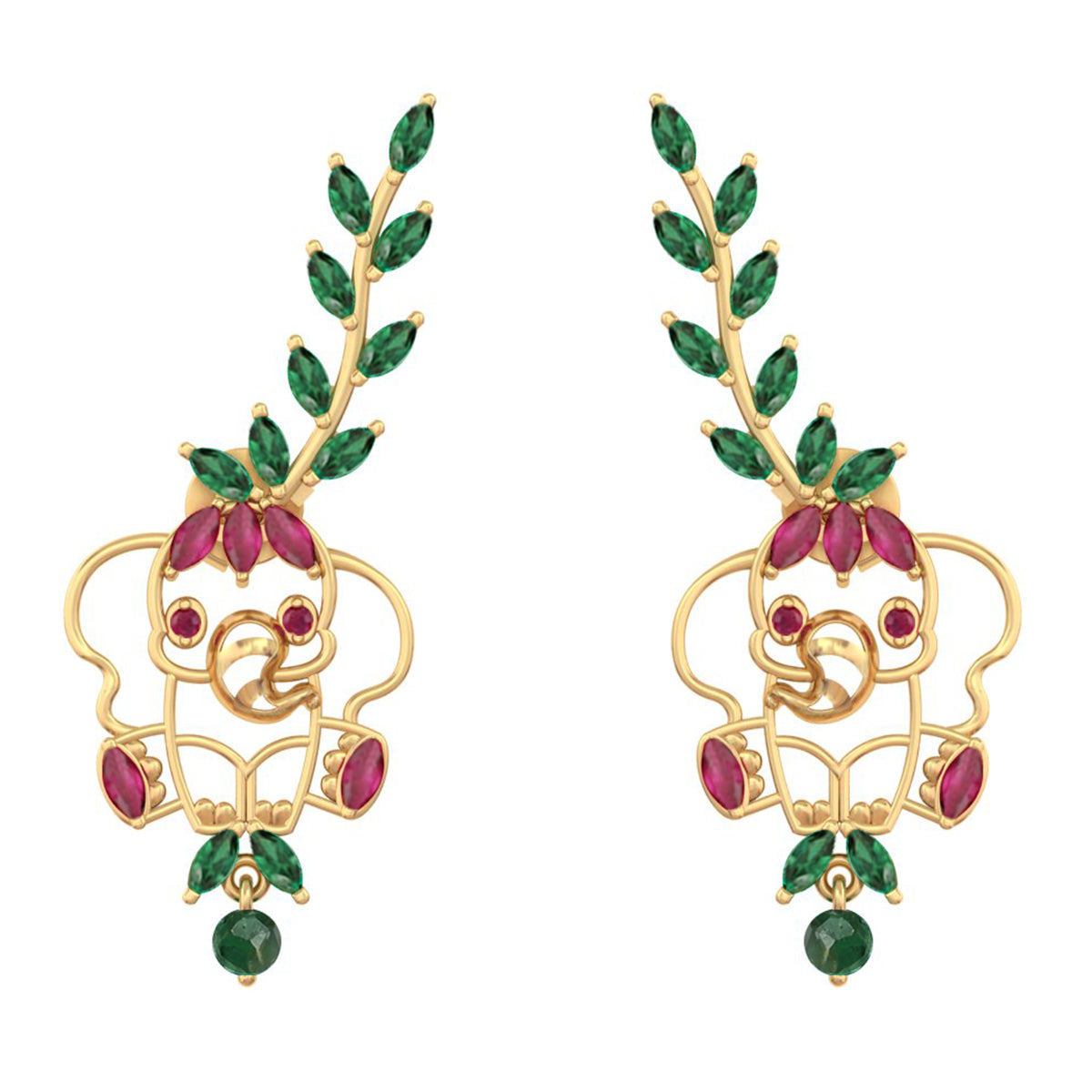 A beautifully detailed ear cuff earring featuring a charming baby elephant, adorned with vibrant pink and green stones. The design extends gracefully along the ear with delicate leaf motifs, adding a nature-inspired elegance while keeping the playful essence alive. Perfect for festive occasions or statement styling without feeling heavy.