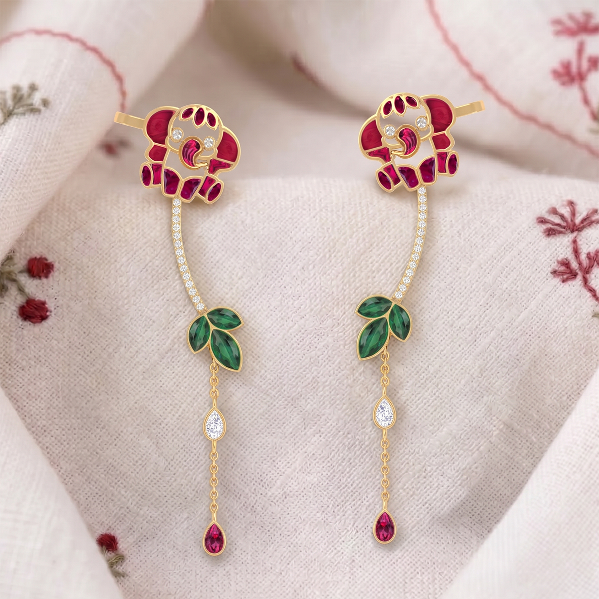 A graceful ear cuff earring featuring a delicately crafted baby elephant, highlighted with soft pink kundan detailing. The design flows elegantly along the ear in a sleek vine-like curve, accented with sparkling stones and green leaf motifs, ending in a subtle drop for added movement. It beautifully blends playful charm with refined elegance, making it perfect for festive occasions or standout styling without feeling heavy.