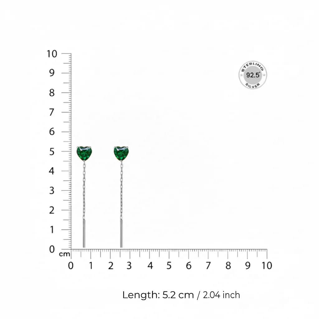 Elegant, modern, and effortlessly eye-catching these Emerald Heart Silver Drop Earrings are crafted in high-quality 925 sterling silver. Each earring features a striking emerald-green heart-cut stone that sits beautifully on the ear, paired with a sleek, minimal silver chain drop for graceful movement and a refined finish.