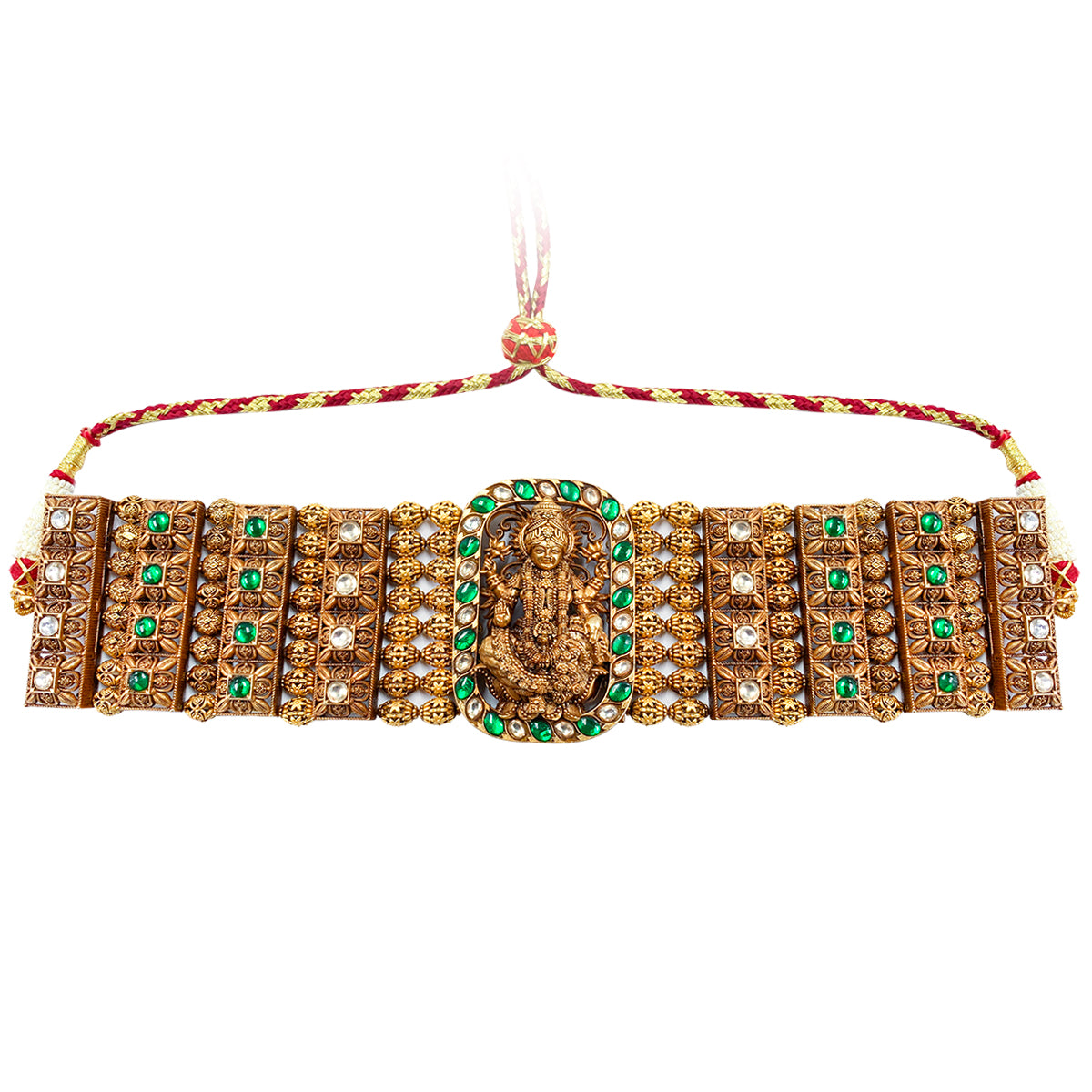 A timeless expression of South Indian artistry, this handcrafted temple choker features a beautifully carved Goddess Lakshmi motif as its centrepiece — a symbol of abundance, protection, and grace. Each panel is meticulously created using traditional nakshi work, forming a striking grid pattern embellished with emerald-green stones and sparkling white kundan accents.