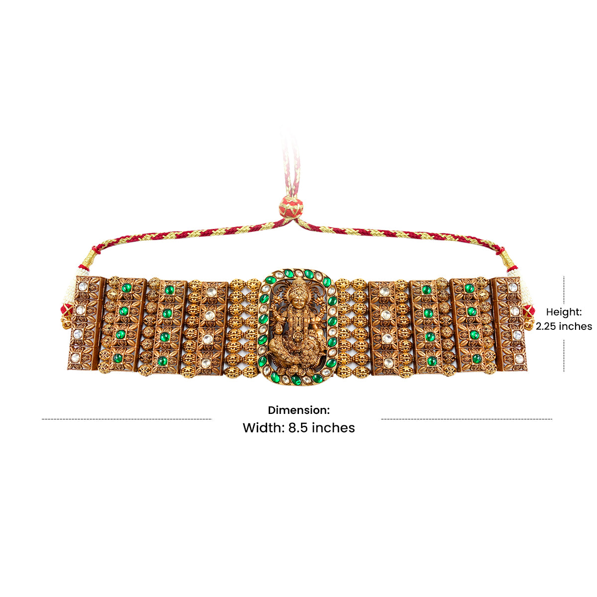 The antique gold finish adds a rich, heirloom-like patina, making this choker a statement piece that sits elegantly along the neckline. The structured block design lends a regal silhouette, perfect for bridal wear, temple ceremonies, classical dance, and festive occasions.