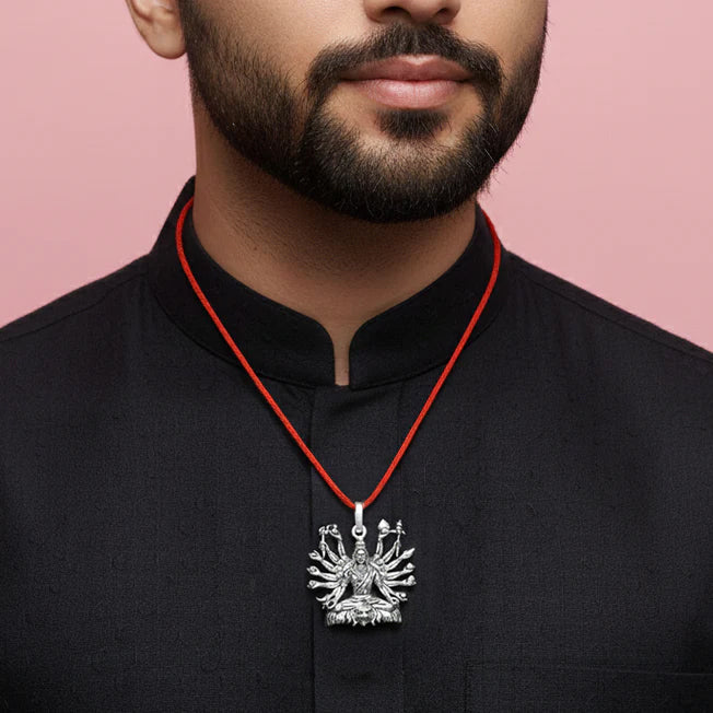Invoke strength, protection, and serenity with this exquisitely handcrafted Mahashakti pendant, cast in pure silver. Designed with striking detail, the deity is depicted seated in calm meditation while radiating powerful energy through her multiple arms, each holding symbolic weapons and blessings.