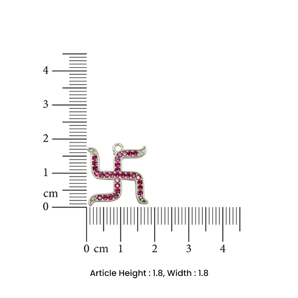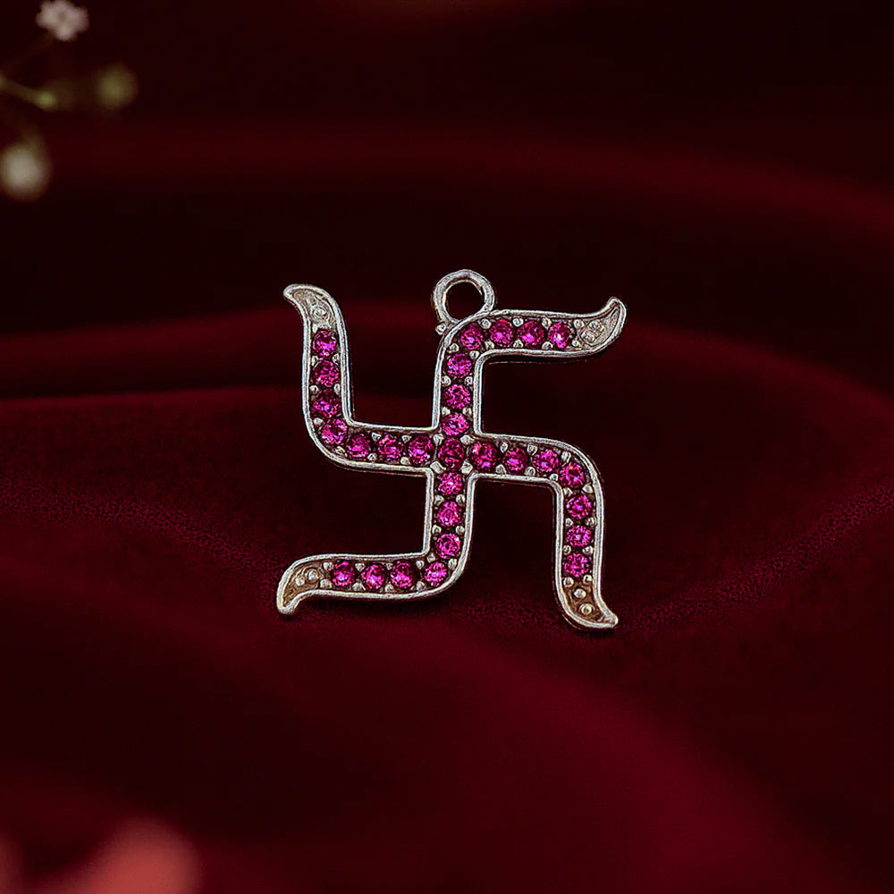 A beautifully crafted Swastik Keepsake, symbolizing prosperity, good fortune, and protection. This design is embellished with vibrant pink stones set in a silver-tone base, giving it a striking yet elegant look. Perfect for wearing as a spiritual accessory, gifting during festivals, or adding to daily jewelry for auspicious energy. Lightweight and versatile, it can be paired with both traditional and modern attire.