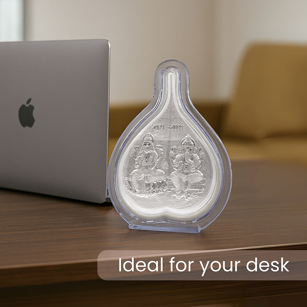 Celebrate the spirit of prosperity and blessings with this 999 Pure Silver Laxmi-Ganesha Keepsake, beautifully set in a unique paan-shaped acrylic stand. Featuring Goddess Laxmi and Lord Ganesha in intricate silver detailing, this piece radiates divine energy and symbolizes wealth, wisdom, and good fortune.