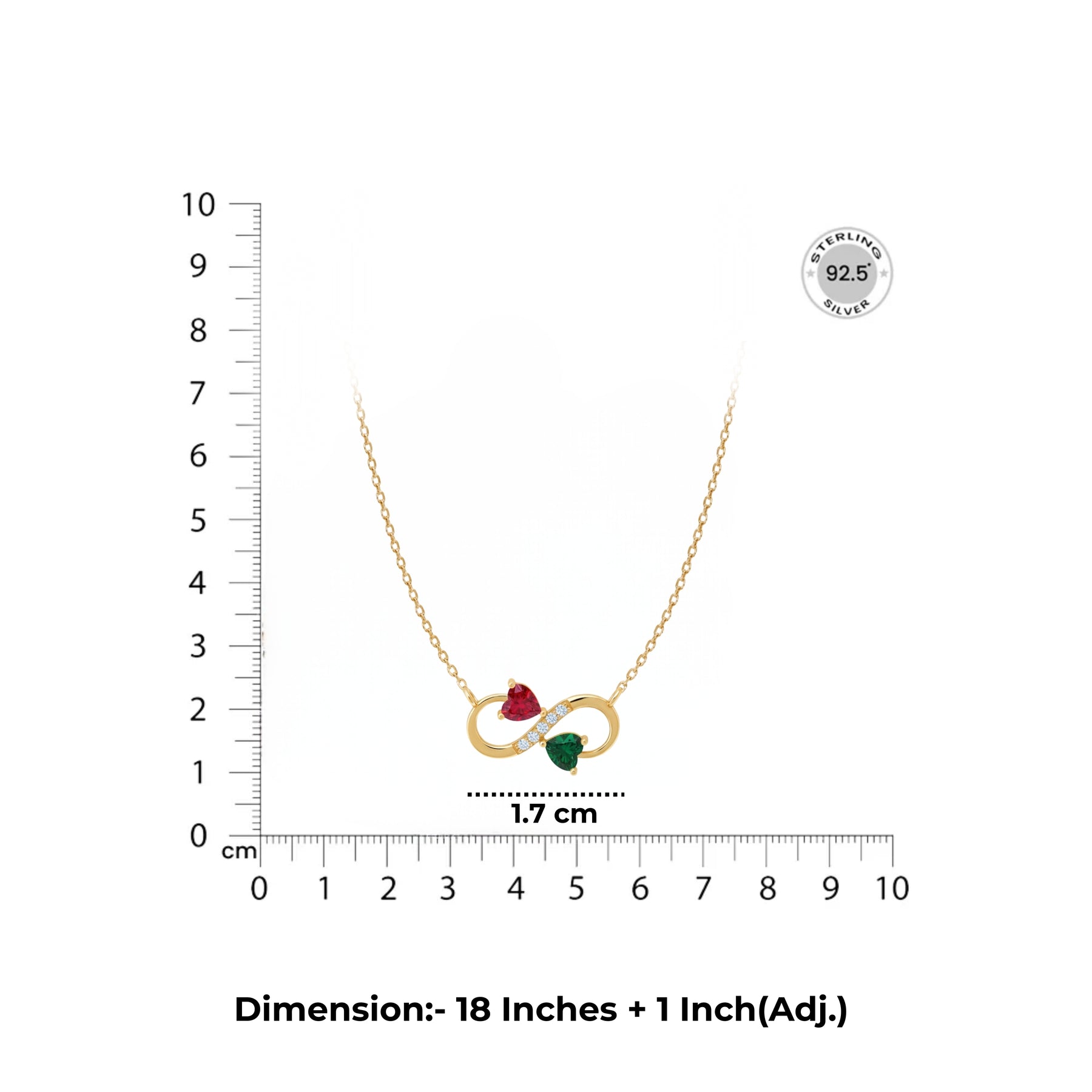 Celebrate love, balance, and togetherness with this elegant Twin Hearts Infinity Necklace, crafted in high-quality 925 silver. The polished infinity symbol is adorned with sparkling CZ stones at the centre, while two heart-shaped gemstones one in vibrant ruby red and the other in rich emerald green sit gracefully at each loop, symbolizing two souls connected forever.