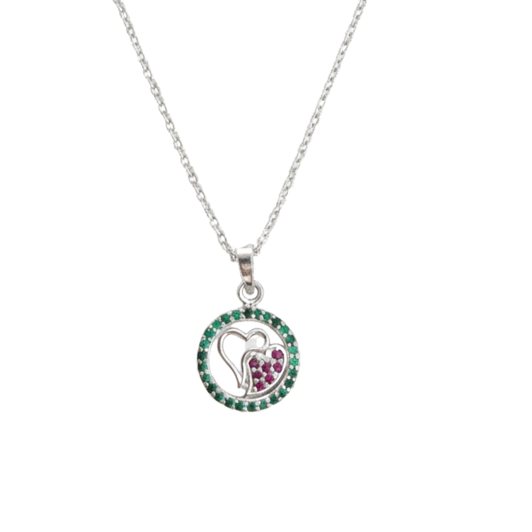 Elegant, meaningful, and beautifully detailed this Dual Heart Circle Silver Necklace is crafted in high-quality 925 sterling silver. The pendant features two intertwined hearts: one in a sleek silver finish and the other adorned with sparkling pink stones. Surrounding them is a vibrant emerald-green stone halo, adding contrast, colour, and a festive touch.