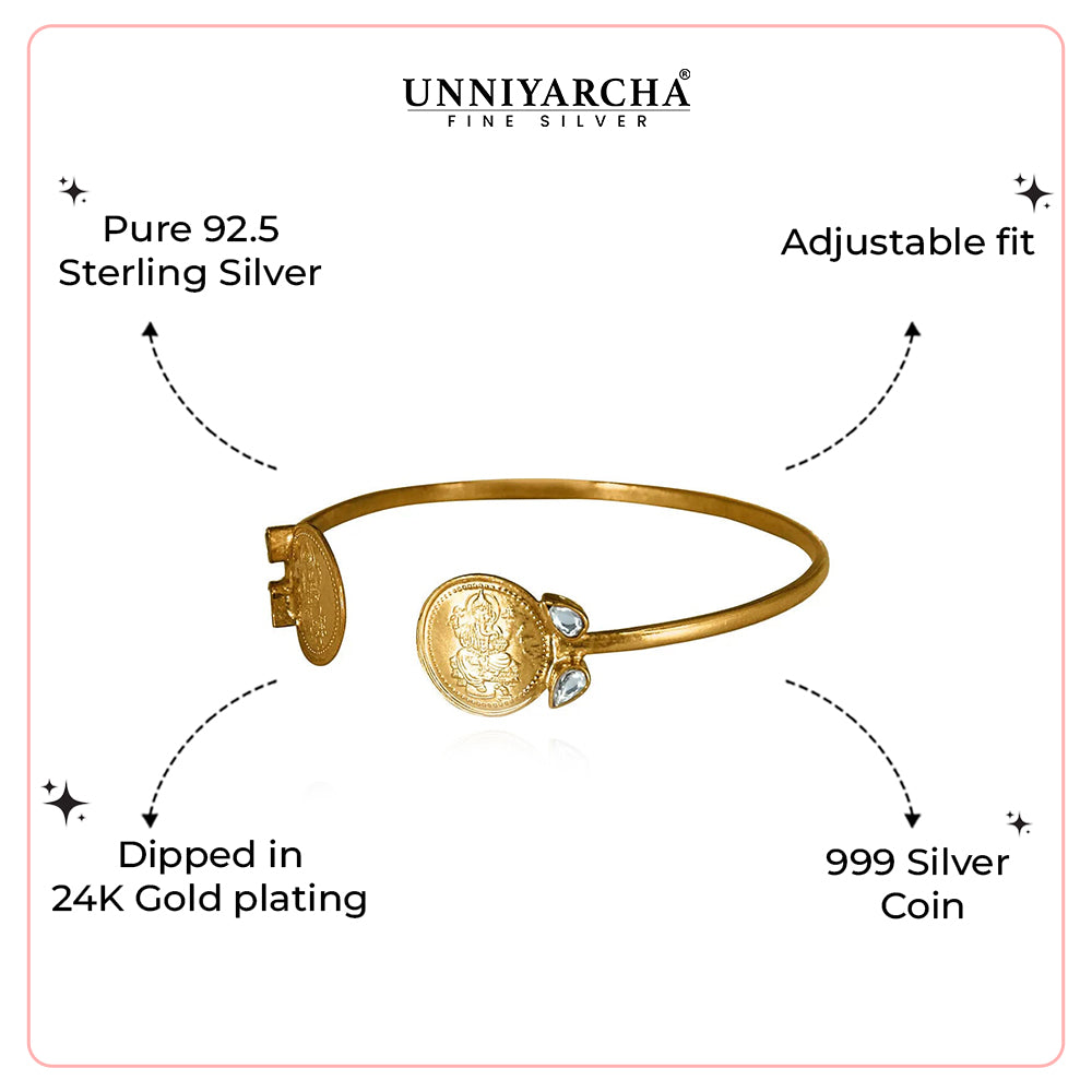 This beautiful Kada has 999 silver coins with a Lord Ganesha motif and polki around it, giving the design a beautiful glow.