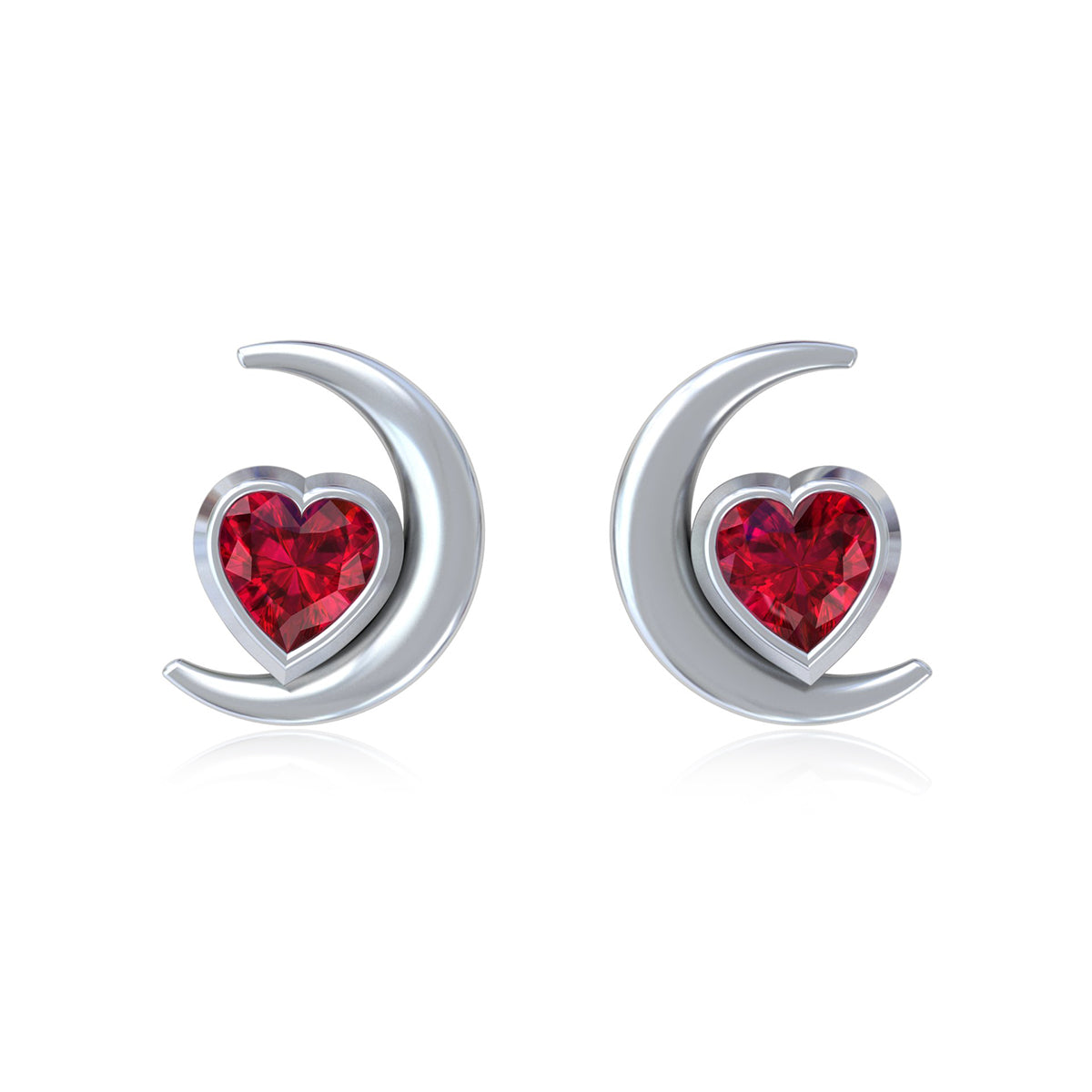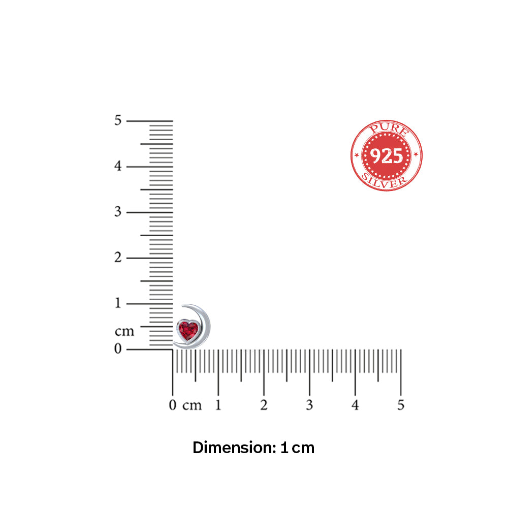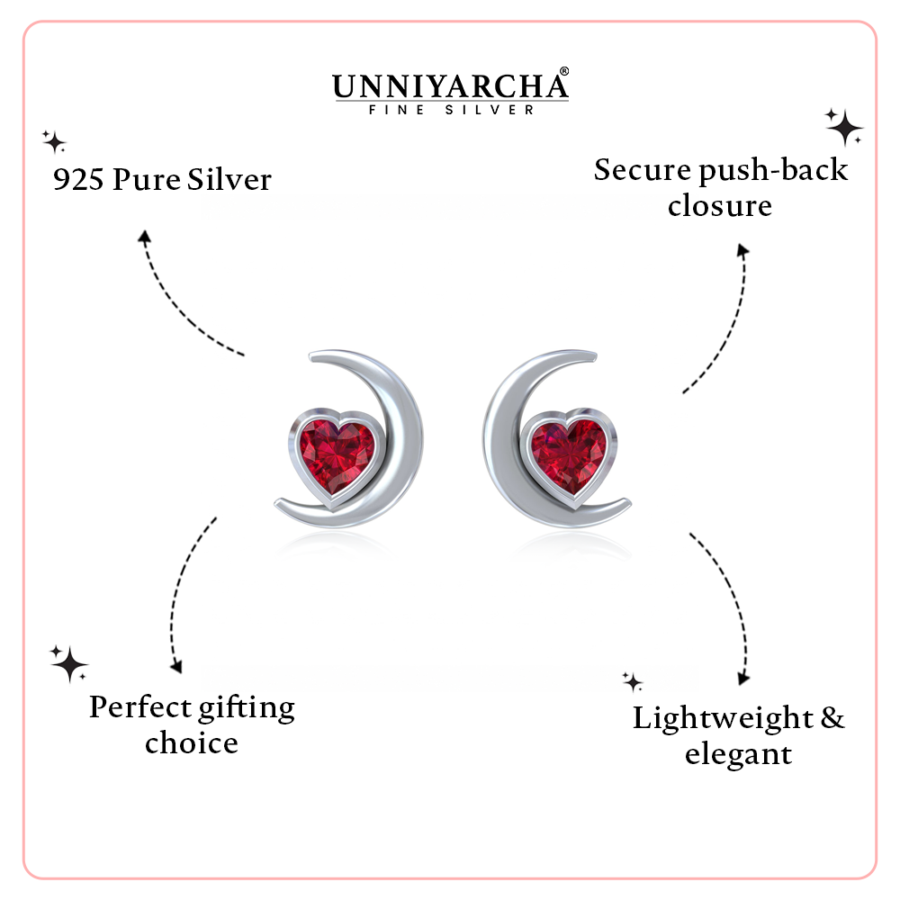Delicately crafted in 925 sterling silver, these elegant stud earrings feature a graceful crescent moon design embracing a radiant ruby-red stone at the centre. The smooth silver curve beautifully highlights the vibrant gemstone, creating a look that is both minimal and captivating.
