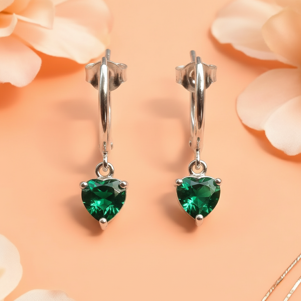 Add a touch of elegance and colour to your look with these Emerald Heart Silver Hoop Earrings, crafted in 925 sterling silver. The sleek mini-hoop design holds a dangling emerald-green heart-cut stone, creating a perfect blend of modern minimalism and romantic charm.
