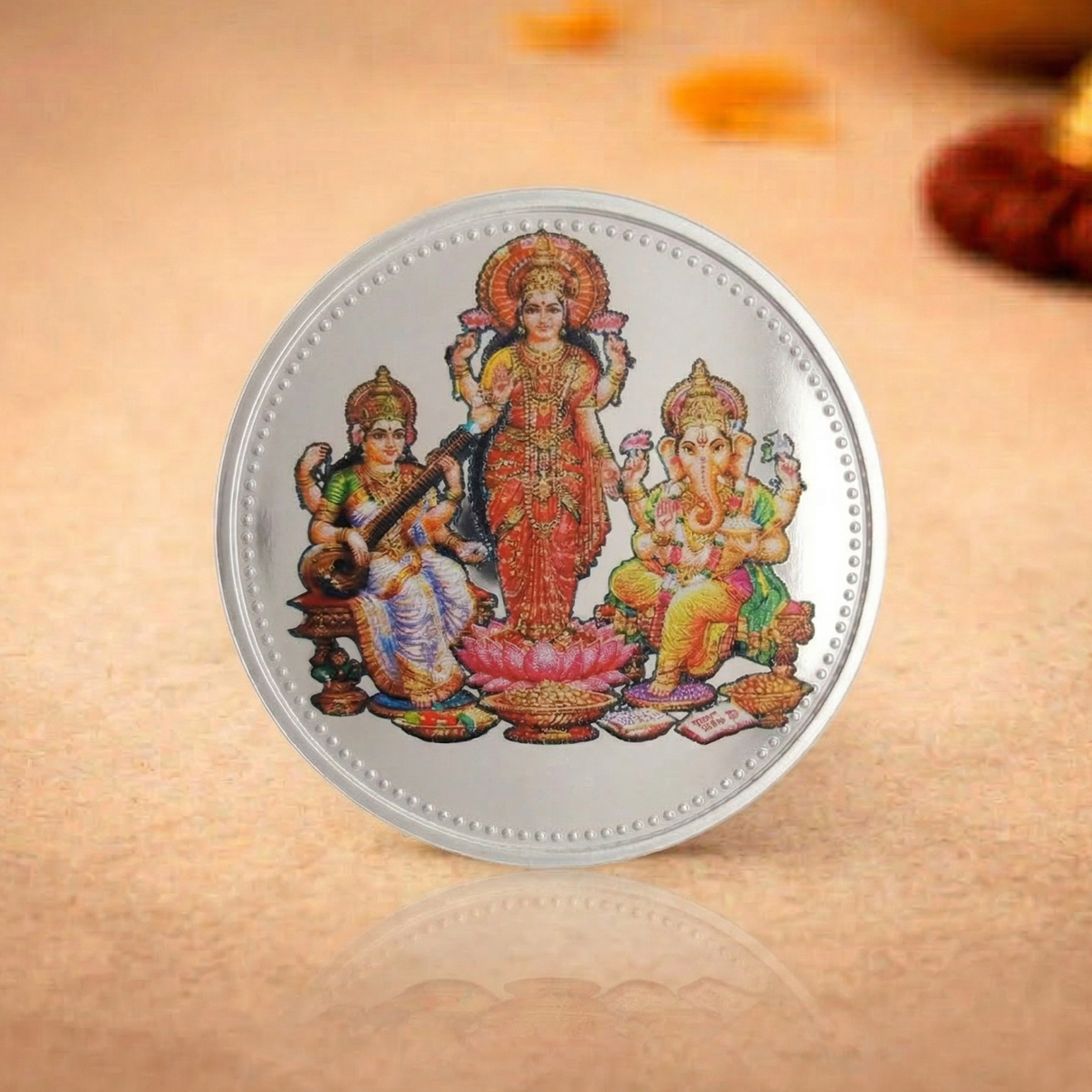 Bring home the blessings of all three deities — Goddess Lakshmi (wealth), Goddess Saraswati (knowledge), and Lord Ganesha (prosperity) — in one beautifully crafted 20 gram 999 pure silver coin. The vibrant full-color print on the obverse and the authentic 999 silver stamp on the reverse make this coin as spiritually meaningful as it is valuable.