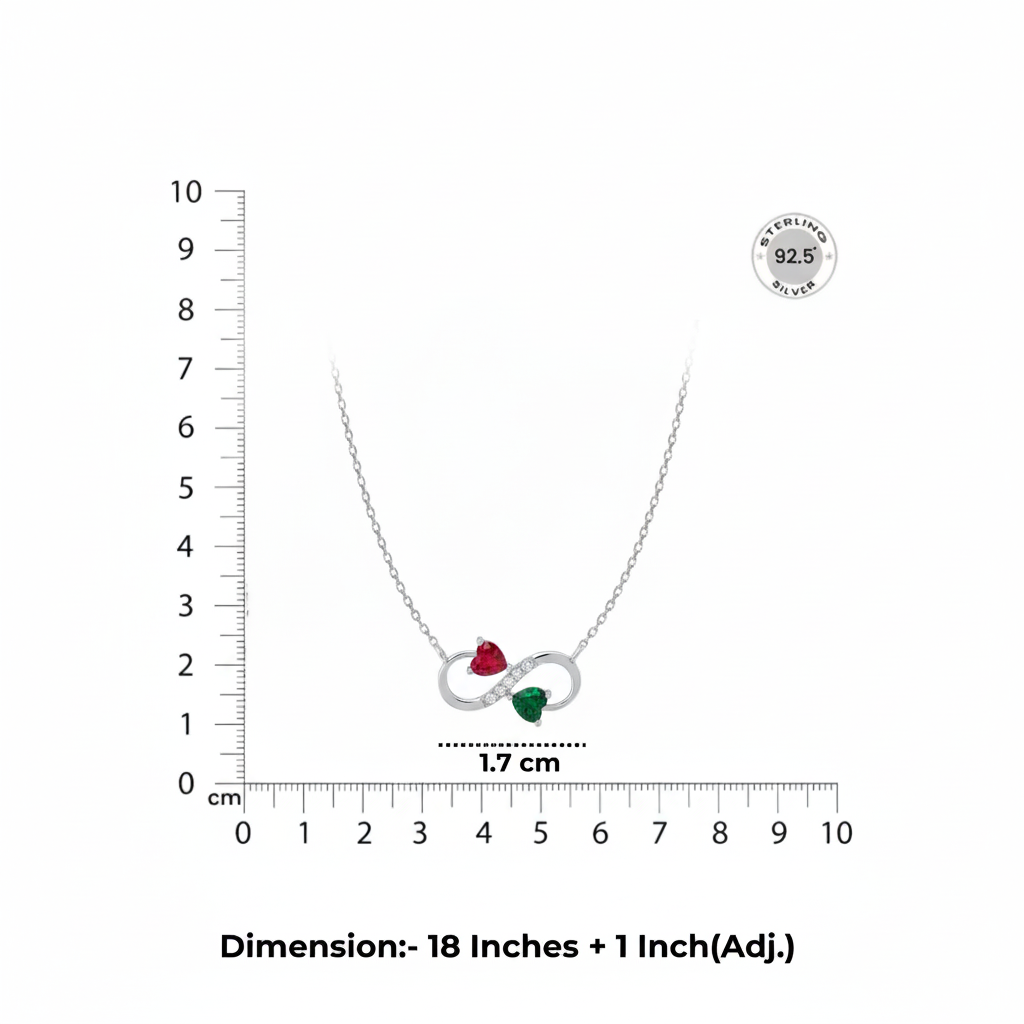 Celebrate love, balance, and togetherness with this elegant Twin Hearts Infinity Necklace, crafted in high-quality 925 silver. The polished infinity symbol is adorned with sparkling CZ stones at the centre, while two heart-shaped gemstones one in vibrant ruby red and the other in rich emerald green sit gracefully at each loop, symbolizing two souls connected forever.