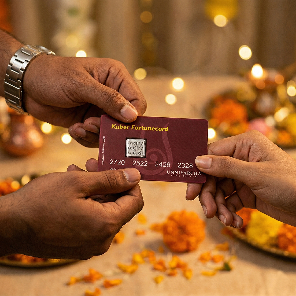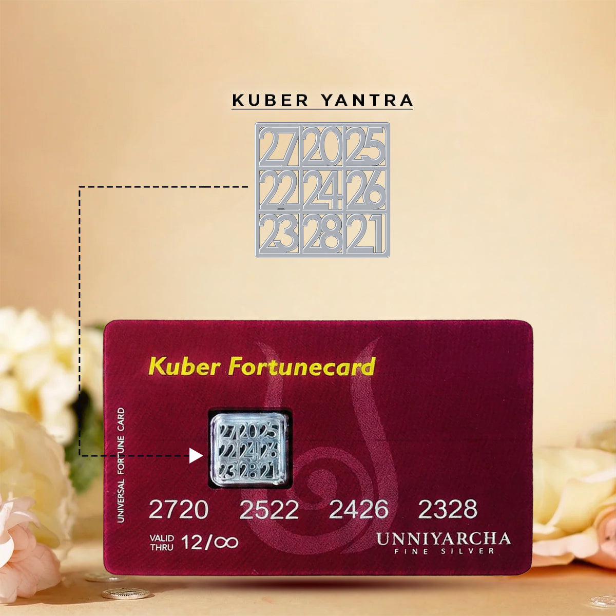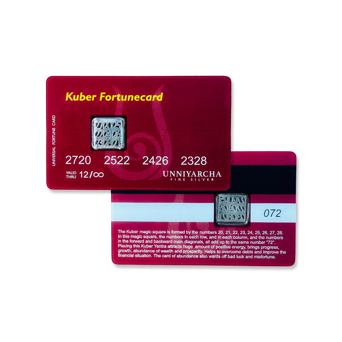 Carry the divine energy of Lord Kuber - the god of wealth and abundance - in your wallet, every single day. The Kuber Fortunecard is a first-of-its-kind prosperity card featuring a 925 Sterling Silver Kuber Yantra embedded like a chip — just as a credit card carries its power in a tiny chip, this card carries the sacred geometry of the Kuber Yantra to attract wealth, fortune, and financial blessings wherever you go.