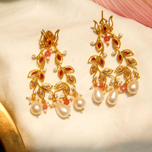 Grab these extremely stunning Lotus design earrings which have got pearl drops hanging to create a striking look. It is composed of zircon, semi-precious stones, pearls.