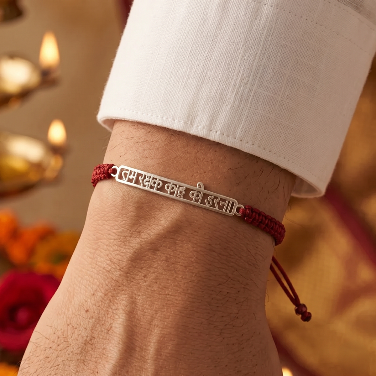 Carry a message of courage and protection wherever you go. This meaningful bracelet features a pure 925 silver bracelet beautifully engraved with the powerful Hindi mantra: “Tum Rakshak Kahu Ko Darna” (When you are my protector, why should I fear?).