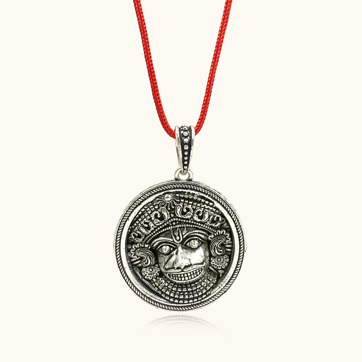 Celebrate strength and protection with this intricately handcrafted oxidised silver pendant inspired by traditional South Indian mythology. The bold central deity motif rich in texture and detail symbolises power, courage, and divine guardianship. Set against a beautifully carved circular frame and paired with a striking red cord, this statement piece adds cultural depth and artistic charm to any look.
