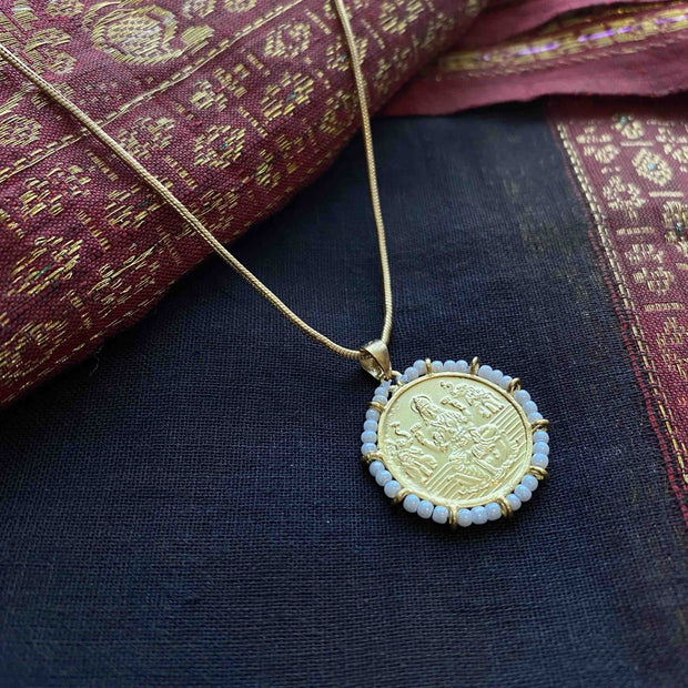 This beautiful necklace has 999 pure silver coin in the center with pearls around it. The coin has a Lakshmi motif, perfect for both yourself and gifting.