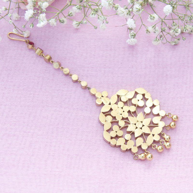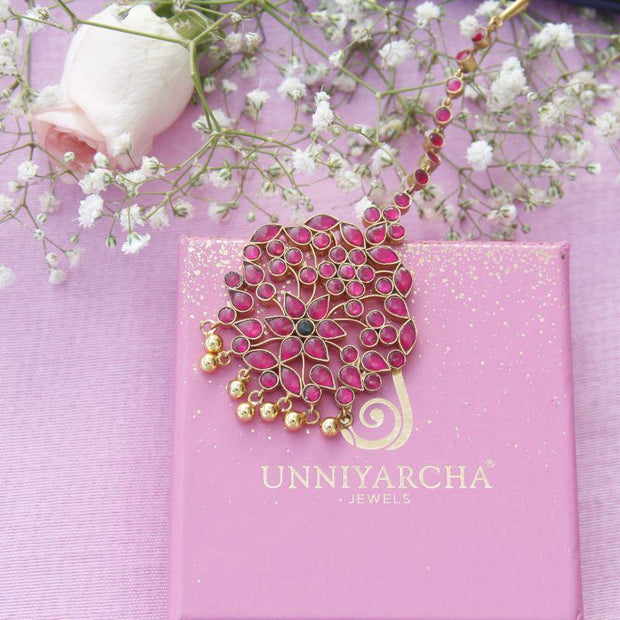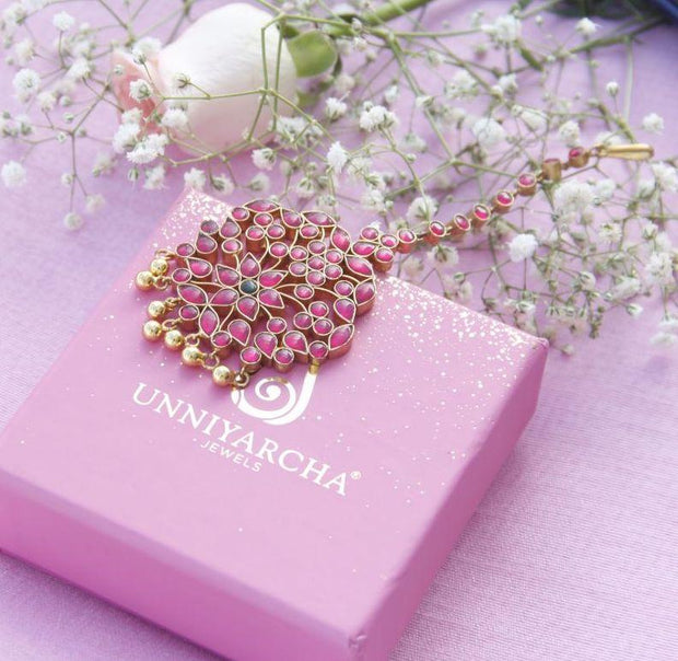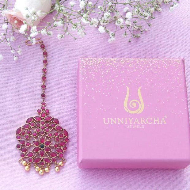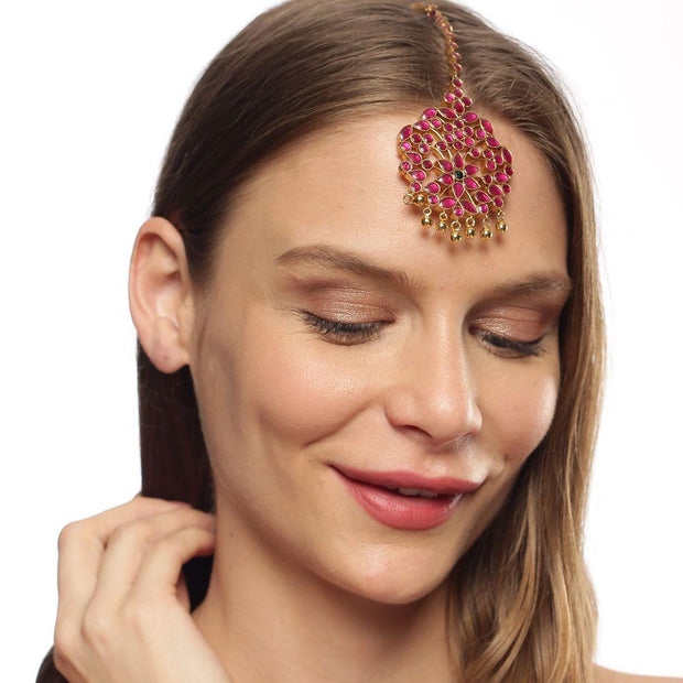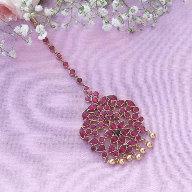 This beautiful maangtika is composed of 92.5 pure silver and glass stones and gold plated silver beads.
